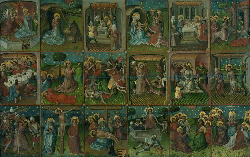| Keywords: Roermondse passie.jpg Artwork LangSwitch Achtzehn Szenen aus dem Leben Christi bekannt als die Roermonder Passion <ref>https //www rijksmuseum nl/collectie/SK-A-1491 Achttien taferelen uit het leven van Christus bekend als de Roermondse passie - Rijksmuseum Amsterdam - National Museum for Art and History Titel übersetzt von Wikimedia Commons </ref> Eighteen scenes from the life of Christ known as the Roermond Passion <ref>https //www rijksmuseum nl/collectie/SK-A-1491 Achttien taferelen uit het leven van Christus bekend als de Roermondse passie - Rijksmuseum Amsterdam - National Museum for Art and History </ref> Dix-huit épisodes de la vie du Christ dit la Passion de Roermond <ref>https //www rijksmuseum nl/collectie/SK-A-1491 Achttien taferelen uit het leven van Christus bekend als de Roermondse passie - Rijksmuseum Amsterdam - National Museum for Art and History titre traduit par Wikimedia Commons </ref> Achttien taferelen uit het leven van Christus bekend als de Roermondse passie <ref>https //www rijksmuseum nl/collectie/SK-A-1491 Achttien taferelen uit het leven van Christus bekend als de Roermondse passie - Rijksmuseum Amsterdam - Nationaal Museum voor Kunst en Geschiedenis </ref> Alternate titles LangSwitch Roermonder Passion <ref>http //www rkd nl/rkddb/dispatcher aspx action search database ChoiceImages search priref 29140 RKDimages Art-work number 29140 Titel übersetzt von Wikimedia Commons </ref> Eighteen scenes from the life of Christ <ref name RKD >http //www rkd nl/rkddb/dispatcher aspx action search database ChoiceImages search priref 29140 RKDimages Art-work number 29140 title translated by Wikimedia Commons </ref> <br />Roermond Passion <ref name RKD /> Dix-huit épisodes de la vie du Christ <ref name RKD >http //www rkd nl/rkddb/dispatcher aspx action search database ChoiceImages search priref 29140 RKDimages Œuvre d'art numéro 29140 titre traduit par Wikimedia Commons </ref> <br />Passion de Roermond <ref name RKD /> Achttien episoden uit het leven van Christus <ref name RKD >http //www rkd nl/rkddb/dispatcher aspx action search database ChoiceImages search priref 29140 RKDimages Kunstwerknummer 29140 </ref> <br />Roermondse Passie <ref name RKD /> LangSwitch Öl auf Leinwand auf Holz Huile sur toile sur bois Olieverf op doek op paneel Oil on canvas on panel cm 103 167 5 Amsterdam Rijksmuseum Provenance ~ 1435 commission Bela van Mirlaer van Millendonck LangSwitch Zisterzienserinnenkonvent Couvent cistercien Cistercian convent Cisterciënzerinnenklooster Roermond by 1831 LangSwitch Onze-Lieve-Vrouwe-Munsterkerk Kirche Onze-Lieve-Vrouwe-Munsterkerk church Onze-Lieve-Vrouwe-Munsterkerk église Onze-Lieve-Vrouwe-Munsterkerk Roermond by 1879 LangSwitch North Gallery Noordelijke gallerij Onze-Lieve-Vrouwe-Munsterkerk Roermond ProvenanceEvent 1880 loan LangSwitch the au het Nederlandsch Museum voor Geschiedenis en Kunst 4843 The Hague ProvenanceEvent 1889-03 purchase LangSwitch vom the het Rijksmuseum SK-A-1491 Amsterdam LangSwitch die the de Onze-Lieve-Vrouwe-Munsterkerk Roermond www rijksmuseum nl http //www rijksmuseum nl/ lang en Home http //www rijksmuseum nl/aria/aria_assets/SK-A-1491 lang en Info http //www rijksmuseum nl/images/aria/sk/z/sk-a-1491 z Pic SK-A-1491 ~ 1435 1430-1440 Anonymous LangSwitch Geldern Guelders Gueldre Gelre Other versions PD-old-100 LangSwitch Hinweis References Notes Noten <references /> ImageNote 1 544 678 270 326 1600 1006 2 270px<br /> File Roermondse passie detail jpg<br /> LangSwitch Detail Lamentation of Christ with donor portrait of Bela van Mirlaer van Millendonck abbess of the Cistercian convent of the Virgin Mary in Roermond from 1447 Detail Bewening van Christus met donorportret van Bela van Mirlaer van Millendonck abdis van het Onze Lieve Vrouwe Cisterciënzerinnenklooster in Roermond vanaf 1447 ImageNoteEnd 1 1430s paintings Life and teachings of Jesus Christ Early Netherlandish paintings in the Rijksmuseum Amsterdam Anonymous Interior of Munsterkerk Roermond |