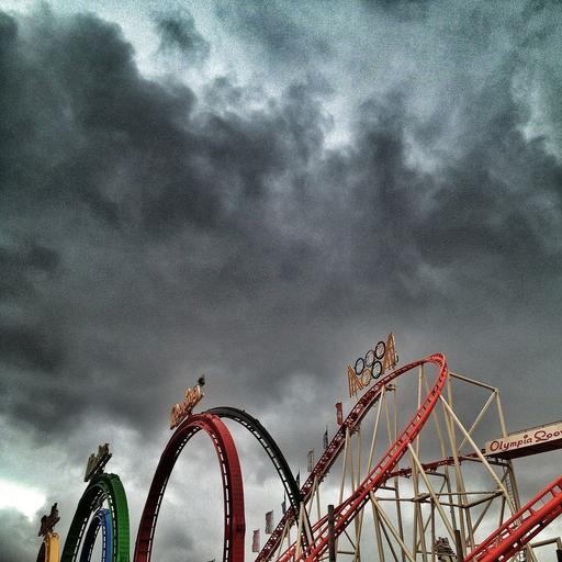 Keywords: roller coaster attraction ride folk festival year market carousel carnies grinding fun action adrenaline drama speed clouds sky