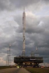 Keywords: Rollout Ares I-X Kennedy Space Center Launch Complex 39 secured four bolts mobile launcher platform