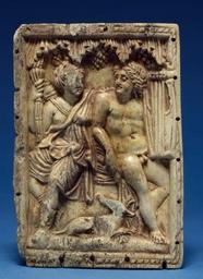 | Keywords: Roman - Artemis and Apollo - Walters 7129.jpg Artemis and Apollo sit on a rock under a grape arbor a dog between them Artemis is dressed in hunting boots and short chiton her quiver visible behind her right shoulder torch in hand Apollo nude holds a stringed instrument a kithera and a plectrum The relief of the slightly convex plaque is framed by a grooved and hatched border pierced with rivet holes Typologically this plaque is related to Walters 71 594 century 4 bone cm 8 9 6 2 accession number 71 29 31947 Dikran Kelekian New York and Paris date and mode of acquisition unknown Henry Walters city Baltimore Walters Art Museum Henry Walters Acquired by Henry Walters 1922 Early Christian and Byzantine Art Baltimore Museum of Art Baltimore 1947 place of origin Aachen Germany Walters Art Museum license Ancient Roman sculptures in the Walters Art Museum Media contributed by the Walters Art Museum needs category review Reliefs of Artemis Reliefs of Apollo Dogs in art Nude or partially nude people with dogs |