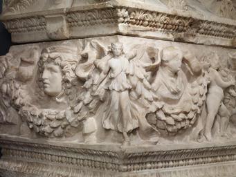| Keywords: Roman - Garland Sarcophagus - Walters 2329 - Detail D.jpg Unlike many sarcophagi this one is carved on all four sides in high relief Garlands held by winged goddesses or personifications on the corners and Eros Cupid figures on the sides support the busts of a crowned deity left and a young girl right The sarcophagus was probably intended for her In the center on both the front and back is a theatrical mask-on this side Tragedy on the other Comedy Medusa heads decorate the ends The lid takes the form of a temple roof with a pediment triangular gable at each end This sarcophagus can be traced to a particular workshop active near the ancient quarry of Dokimeion in Phrygia in Asia Minor Its discovery in Rome illustrates the long-distance trade in even very large heavy luxury goods that took place at the height of the Roman Empire between 150 180 Imperial Dokimeion marble cm 83 5 143 35 69 85 accession number 23 29 30186 Excavated from the so-called Licinian tomb Rome 1885 Don Marcello Massarenti Collection Rome 1885 by excavation Henry Walters city Baltimore Walters Art Museum Henry Walters Acquired by Henry Walters with the Massarenti Collection 1902 Treasures of Heaven The Cleveland Museum of Art Cleveland; The Walters Art Museum Baltimore; The British Museum London 2010-2011 place of origin Phrygia in present-day Turkey Walters Art Museum license Ancient Roman art in the Walters Art Museum Media contributed by the Walters Art Museum needs category review |