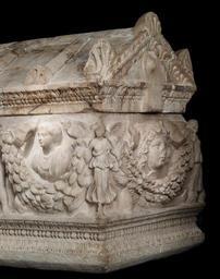 | Keywords: Roman - Garland Sarcophagus - Walters 2329 - Detail G.jpg Unlike many sarcophagi this one is carved on all four sides in high relief Garlands held by winged goddesses or personifications on the corners and Eros Cupid figures on the sides support the busts of a crowned deity left and a young girl right The sarcophagus was probably intended for her In the center on both the front and back is a theatrical mask-on this side Tragedy on the other Comedy Medusa heads decorate the ends The lid takes the form of a temple roof with a pediment triangular gable at each end This sarcophagus can be traced to a particular workshop active near the ancient quarry of Dokimeion in Phrygia in Asia Minor Its discovery in Rome illustrates the long-distance trade in even very large heavy luxury goods that took place at the height of the Roman Empire between 150 180 Imperial Dokimeion marble cm 83 5 143 35 69 85 accession number 23 29 30186 Excavated from the so-called Licinian tomb Rome 1885 Don Marcello Massarenti Collection Rome 1885 by excavation Henry Walters city Baltimore Walters Art Museum Henry Walters Acquired by Henry Walters with the Massarenti Collection 1902 Treasures of Heaven The Cleveland Museum of Art Cleveland; The Walters Art Museum Baltimore; The British Museum London 2010-2011 place of origin Phrygia in present-day Turkey Walters Art Museum license Ancient Roman art in the Walters Art Museum Media contributed by the Walters Art Museum needs category review |