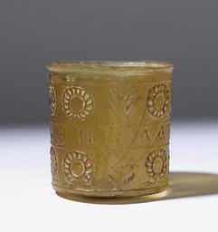 | Keywords: Roman - Glass Cup with Wreaths - Walters 4755 - Side D.jpg The Greek inscription on this amber-colored cylinder-shaped vessel has a reversed letter N a common mistake for an artisan writing on a mold Wreaths palm branches and the inscription reading Take the victory indicate that the vessel was made to celebrate a contest or honor early Other date century 1 Augustan molded glass cm 6 8 6 9 h x diam accession number 47 55 6779 Dikran Kelekian Paris and New York Henry Walters city Baltimore Walters Art Museum Henry Walters Acquired by Henry Walters 1925 Translation Take the victory 3000 Years of Glass Treasures from The Walters Art Gallery The Walters Art Gallery Baltimore 1982 place of origin east Mediterranean Walters Art Museum license Ancient Roman glassware in the Walters Art Museum 1st-century art in the United States Glass Ancient Greek inscriptions in the United States Glass cup Ancient Roman drinking glasses Usa |