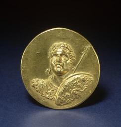 | Keywords: Roman - Medallion with Alexander the Great - Walters 591 - Obverse.jpg Together with Walters 59 2 and 59 3 this piece was discovered in Egypt as part of a hoard that comprised about twenty similar medallions now dispersed among various museums eighteen gold ingots and six hundred gold coins issued by Roman emperors from Severus Alexander r AD 222-235 to Constantius I r AD 293-306 One of the medallions now in the Calouste Gulbenkian Museum in Lisbon bears an inscription that possibly reads Olympic games of the year 274 a date corresponding to AD 242-243 It is possible that the medallions were intended as prizes to be given out at that event Alternatively they may have been issued by Emperor Caracalla r AD 198-217 who is potrayed on some of them Caracalla liked to be compared to the great king and conquerror Alexander of Macedon ruled 336-323 BC Like Alexander this Roman emperor waged war in the East and actually died in the course of his campaign against the Parthians This particular medallion shows Alexander the Great gazing heavenward and bearing a shield decorated with signs of the zodiac This portrait shows him with his hair pulled back He wears a decorated cuirass with a figure of Athena on the shoulder strap and on the chest a scene from the Gigantomachy War of the Giants The back depicts Alexander and Nike goddess of victory riding in a chariot flanked by the deities Roma and Mars ca 215 243 Imperial Roman gold Diam 2 1/8 x D 5/16 in 5 34 x 0 75 cm accession number 59 1 21555 Discovered at Aboukir Egypt in 1902 P Kytikas Cairo by purchase Dikran Kelekian New York and Paris date of acquisition unknown by purchase Henry Walters Baltimore date of acquisition unknown by purchase Walters Art Museum Henry Walters Acquired by Henry Walters Translation BASILEOS ALEXANDROY Alexander the King The Search for Alexander The Art Institute of Chicago Chicago; New Orleans Museum of Art New Orleans; Royal Ontario Museum Toronto; National Gallery of Art Washington; Museum of Fine Arts Boston Boston; Fine Arts Museums of San Francisco San Francisco 1980-1983 Lisippo L'Arte e la Fortuna Fortune of Lisippus Palazzo delle Esposizioni Rome 1995 Alexander the Great Treasures from an Epic Era of Hellenism Alexander S Onassis Public Benefit Foundation USA New York 2004-2005 Heroes Mortals and Myths in Ancient Greece The Walters Art Museum Baltimore; Frist Center for the Visual Arts Nashville; San Diego Museum Of Art San Diego; Alexander S Onassis Public Benefit Foundation USA New York 2009-2011 place of origin Macedonia Walters Art Museum license Ancient Roman art in the Walters Art Museum Art of Roman Egypt in the Walters Art Museum Reliefs of Alexander the Great Media contributed by the Walters Art Museum needs category review Zodiac in ancient Roman art Egyptian sculptures of Alexander the Great Ancient art from Alexandria Medals of Egypt |
