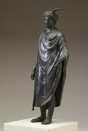 | Keywords: Roman - Mercury - Walters 54605 - Three Quarter Left.jpg The wings one missing on the head of this figure identify it as representing Mercury the messenger of the gods It is exquisitely detailed and larger than most statuettes made for household worship suggesting that it was prominently displayed within the villa of a wealthy Roman family The hairstyle dates the piece to the mid 1st century when artists were still very much influenced by the Classical style of Greek art His left hand would have held the caduceus or herald's staff that is his attribute familiar today as a medical symbol AD 40-80 Julio-Claudian ; Flavian cast bronze with silver coat and inlay cm 29 2 11 8 5 6 accession number 54 605 25406 Henry Walters Baltimore date and mode of acquisition unknown Walters Art Museum Henry Walters Acquired by Henry Walters The Gods Delight The Human Figure in Classical Bronze The Cleveland Museum of Art Cleveland 1988-1989 place of origin Roman Empire Walters Art Museum license Ancient Roman sculptures in the Walters Art Museum Ancient Roman bronze statuettes of Mercurius Media contributed by the Walters Art Museum needs category review |