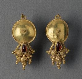 | Keywords: Roman - Pair of Gold Earrings - Walters 571522, 571523.jpg This pair of earrings is decorated with coarse filigree and granulation century 3 AD gold garnet cm 3 2 1 4 1 4 accession number 57 1522 57 1523 77450 Henry Walters Baltimore date of acquisition unknown by purchase Walters Art Museum Henry Walters Acquired by Henry Walters place of origin Roman Empire Walters Art Museum license Ancient Roman art in the Walters Art Museum Jewellery in the Walters Art Museum Ancient Roman earrings Media contributed by the Walters Art Museum needs category review |