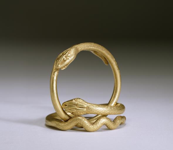 | Keywords: Roman - Pair of Snake Bracelets - Walters 57528, 57529 - Group.jpg In the ancient Greek and Roman world snakes symbolized fertility and were believed to ward off evil It is probably due to the animal's protective associations that solid gold snake rings and bracelets were among the most popular types of Greek and Roman jewelry Snake bracelets were often worn in pairs around the wrists as well as on the upper arms century 1 AD gold cm 8 2 accession number 57 528 57 529 77931 Henry Walters Baltimore date and mode of acquisition unknown Walters Art Museum Henry Walters Acquired by Henry Walters place of origin Roman Empire Walters Art Museum license Ancient Roman art in the Walters Art Museum Jewellery in the Walters Art Museum Snakes in art Ancient Roman snake jewellery Ouroboros Animal duos in art Bracelets Jewellery Two reptiles |