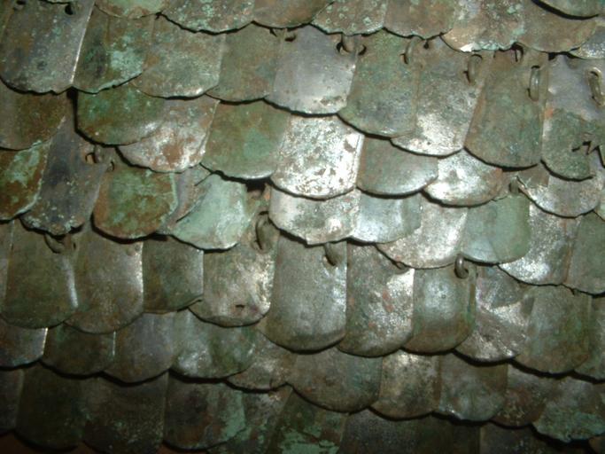 | Keywords: Roman scale armour detail.JPG Roman scale armour detail of a fragment Each scale has six holes and the scales are linked in rows Photograph was taken in the Somerset County Museum in Taunton on 29-Oct-05 2005-04-01 own assumed Gaius Cornelius Bronze armour Lorica squamata Somerset County Museum |