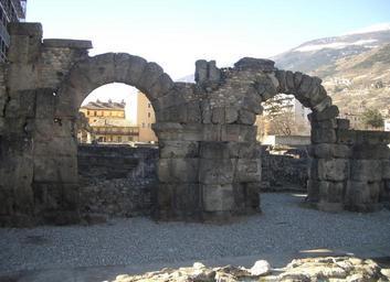 Keywords: Roman Theatre Aosta 2.JPG Picture of the Roman Theatre in Aosta Italy “ View of the arcades of the right side of the theatre 2007-01-28 own assumed Laurom Ancient Roman theatre Aosta Arches in Aosta Valley