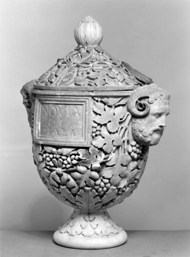 | Keywords: Roman - Urn with Lid - Walters 23180 - Three Quarter.jpg The name of the deceased Novia Clara appears on the front of this urn The two handles are each in the form of a mask of Zeus-Ammon the Hellenistic version of the powerful Egyptian god Amen whose ram-horns curl around his ears The lid preserves the lead clamps used to secure it to the vase The base and the finial are restored 50-100 marble Diam 10 5/8 x H 20 1/4 x W 14 7/8 in 27 x 51 5 x 37 8 cm accession number 23 180 30017 Joseph Brummer New York Henry Walters city Baltimore Walters Art Museum Henry Walters Acquired by Henry Walters 1925 place of origin Rome Italy Walters Art Museum license Ancient Roman art in the Walters Art Museum Media contributed by the Walters Art Museum needs category review |
