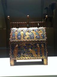| Keywords: Romanesque Treasure of MNAC- Arqueta resurrecci贸 (1).jpg El recorregut de la secci贸 de rom脿nic culmina amb els objectes d 檕rfebreria que constitu茂en els tresors de les esgl茅sies medievals Aquests objectes tenien una funci贸 lit煤rgica per貌 a la vegada formaven el patrimoni material dels temples el seu sistema d 檃cumulaci贸 de riquesa Les vitrines mostren una selecci贸 de peces d 櫭╬oques diverses del fons d 檕rfebreria rom脿nica del Museu Dues es dediquen a l 檃nomenada obra de Llemotges la c猫lebre producci贸 d 檕bjectes de coure esmaltats amb centre en aquesta ciutat del nord d 橭ccit脿nia The Romanesque tour in MNAC culminates with objects of gold which are the treasures of medieval churches These objects have a liturgical function but once formed the material heritage of temples their system accumulation of wealth Showcases a selection of pieces from different periods of the fund of silver Roman Museum Two are dedicated to the work of so-called Limoges famous for producing objects with enameled copper center This northern city of Aquitaine Institution Museu Nacional d'Art de Catalunya 2012-10-25 11 43 13 own PD-Art Romanesque Treasure in the MNAC |