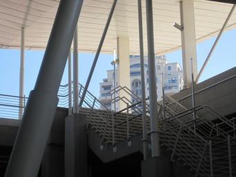 Keywords: roof railings poles uprights lines angles diagonals stairs slants sky