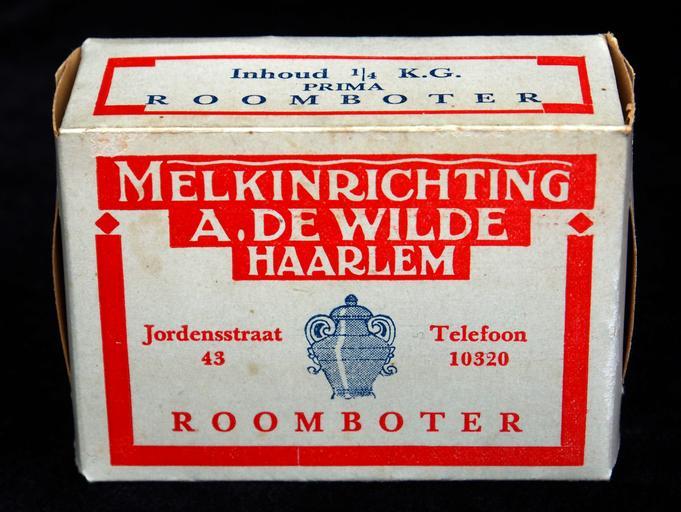 | Keywords: Roomboter pakje van Melkinrichting A de Wilde, Jordensstraat 43 Haarlem, foto2.JPG Very old product that is not produced and not sold any more Note that some tins may look the same but when looked for carefully there are some slight differences Photographed at a collector of Droste memorabilia and old tin cans For more info see http //www tincollectors nl/ tincollectors nl or email info tincollectors nl own 2014-01-25 11 45 42 Alf van Beem CC-Zero Trademarked Butter packaging Food paper cartons Paper packaging Cardboard boxes |