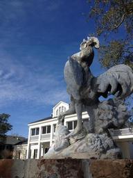 Keywords: rooster gate fence white house statue stonework stone sculpture artwork artistic creative creativity design structure