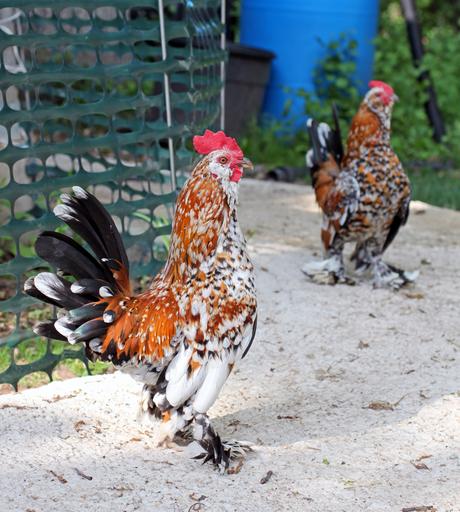 MAKE A MEME View Large Image rooster pair bantam black orange white spots farm pet animal bird feathers sunshine outside fence feather foot poultry