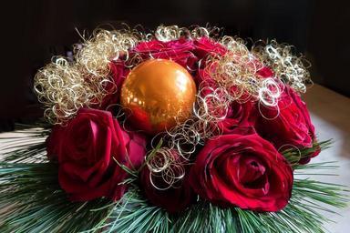 Keywords: rose christmas arrangement gold red christmas ornament jewellery table decorations pine