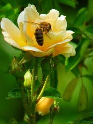 Keywords: rose flower blossom bloom bee sprinkle petal green orange pollen