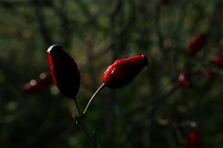 Keywords: rose hip wild rose fruit red nature autumn plant dew dewdrop morning light morning sun branch