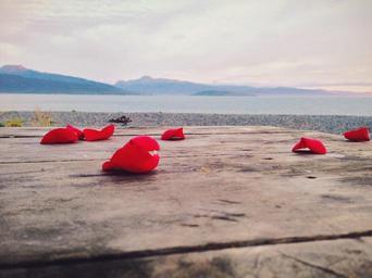 Keywords: rose pedals dock rocks lake water mountains landscape nature outdoors