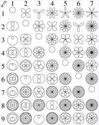 | Keywords: Rose-rhodonea-curve-7x9-chart.svg rose or rhodonea curves based on the polar-coordinates equation r sin θ n/d In this chart the values of parameter n varies from 1 to 7 while d varies from 1 to 9 Based on File Rose-rhodonea-curve-7x7-chart svg which was in turn inflenced by File Rhodonea_curve png but with the rows reversed in the layout of the chart This graphic converted from the following PostScript vector source code a slight modification of that used to produce File Rose-rhodonea-curve-7x7-chart svg <pre> 1 0 0 setrgbcolor 0 0 moveto 600 0 rlineto 0 760 rlineto -600 0 rlineto closepath stroke 0 setgray -4 681 translate/Times-Roman 28 selectfont 10 36 moveto d show 30 60 moveto n show 22 5 49 moveto \\ show/Times-Roman 42 selectfont 1 1 9 /d exch def 12 -18 moveto d 1 string cvs show 1 1 7 /n exch def gsave n 80 mul 0 translate d 1 eq -10 44 moveto n 1 string cvs show if 36 dup scale 01 setlinewidth 1 92 1 setrgbcolor 0 0 1 0 360 arc closepath fill 0 setgray n d gt /res n def /res d def ifelse/w d mul res div/th exch def th n mul d div/x exch def x sin th cos mul x sin th sin mul def 0 w moveto 1 1 360 res mul w lineto for stroke grestore for 0 -80 translate for showpage EOF </pre> Modification of File Rose-rhodonea-curve-7x7-chart svg Modification of by User Mankir of image by User AnonMoos 2009-10-25 Rose-rhodonea-curve-7x7-chart svg Rose curves Images with PostScript source code |