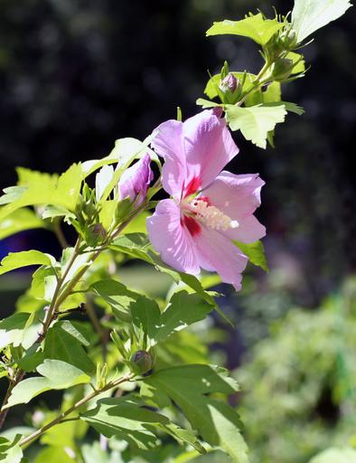 Keywords: rose sharon rose of sharon leaves green leaves pink flower summer spring flower nature fauna flora pink sunshine afternoon