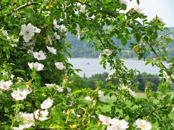Keywords: rosebush blossom spring lake colors landscape