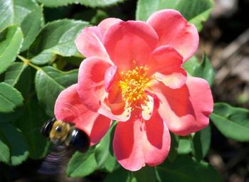 Keywords: roses pink petals green leaves flowering plants bright bumblebee honeybee bee flying hiding leaves background green background dogwood nature garden
