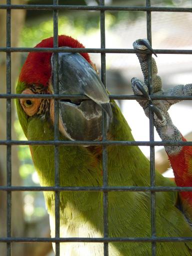 Keywords: rotkopfara parrot cage bird colorful red color bill species animal caught curious imprisoned behind barriers prison awakened exotic nature green grid