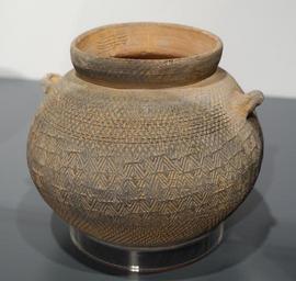 | Keywords: Round-bottomed pottery pot with lozenge pattern, Bronze period, from M112, the pre-Qin graveyard, Hengling Shan, Boluo - Hong Kong Museum of History - DSC00758.JPG en Exhibit in the Hong Kong Museum of History Hong Kong This artwork is old enough so that it is in the public domain Photography was permitted in the museum without restriction 2014-07-27 01 29 20 own Daderot other versions PD-100 cc-zero Chinese ceramics in the Hong Kong Museum of History Uploaded with UploadWizard Ceramics of the Bronze Age in China |