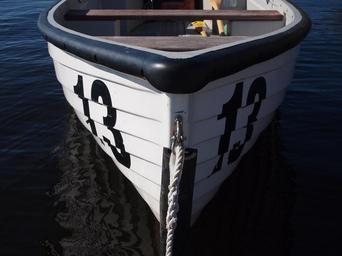 Keywords: rowing boat lake water number 13 outdoors tourism reflection prow symmetry