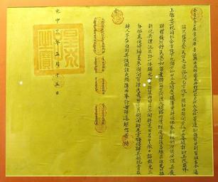| Keywords: Royal order concerning tax exemption, Tay Son dynasty, 15 May of 3rd year of Quang Trung reign (1790 AD), paper - National Museum of Vietnamese History - Hanoi, Vietnam - DSC05654.JPG en Exhibit in the National Museum of Vietnamese History Hanoi Vietnam Photography was permitted in the museum without restriction This artwork is old enough so that it is in the public domain 2014-08-06 03 40 02 own Daderot other versions cc-zero Uploaded with UploadWizard Collections of the National Museum of Vietnamese History Emperor Quang Trung |