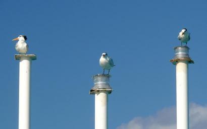 | Keywords: Royal Tern Trio-27527.jpg A trio of Royal Terns Sterna maxima perched atop the flagpoles at the end of the pier at the http //www elcozumeleno com El CozumeleƱo Resort <br>Photo taken with a Panasonic Lumix DMC-FZ50 on the island of Cozumel in Quintana Roo Mexico http //www kenthomas us KenThomas us<br> personal website of photographer 2008-02-02 15 17-06 <sup>ISO 8601</sup> Ken Thomas This image is released to the public domain and therefore no permission or credit is required <br>Comments and/or feedback however are always welcome See my user page for contact info Thalasseus maximus Three birds Taken with Panasonic Lumix DMC-FZ50 |