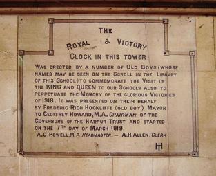 | Keywords: RoyalVictoryClockPlaque.JPG en Plaque in the entrance to the Harpur Centre which used to be Bedford Modern School commemorating the clock which was set up to celebrate victory in World War 1 own Simon Speed 2012-04-14 Unusually for this camera the exif data seems to be correct 52 8 10 07 N 0 28 7 44 W region GB_heading NNW Plaques in Bedford Bedfordshire Schools in Bedford England March 1919 Photos by Simon Speed Taken with Pentax Optio 60 Cc-zero | ||||