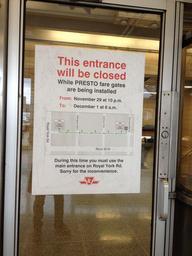 | Keywords: RoyalYorketAl 05.jpg en Sign notifying transit users of closure of Grenview Exit Royal York Station due to installment of PRESTO fare gates 2016-11-26 15 07 02 own G0T0 other versions 43 648506 -79 507942 heading 250 49074074074073 cc-zero Royal York TTC Toronto Transit Commission signs |