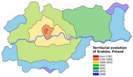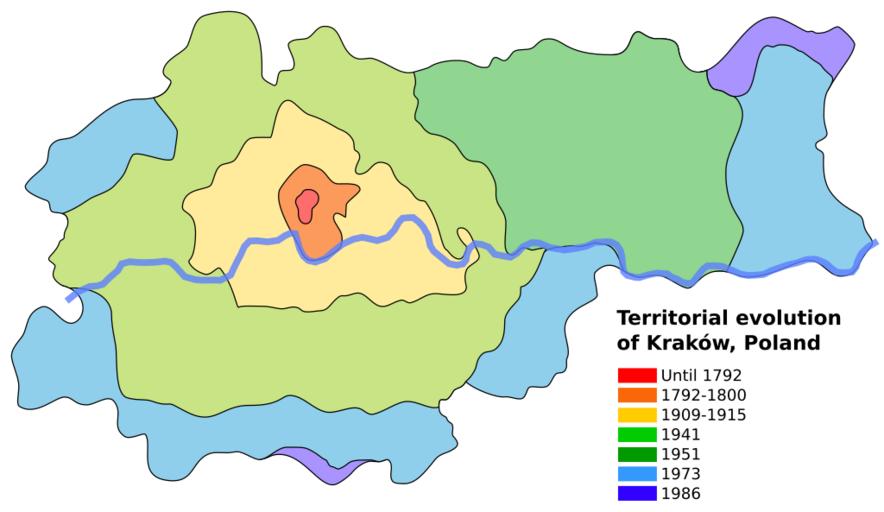 Keywords: Rozwój terytorialny Krakowa - EN.svg en Territorial growth of Kraków Poland from 1792 pl Poszerzanie granic administracyjnych Krakowa own Wojteq 2010-09-13 Original version Polish version Maps of Kraków