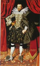 | Keywords: indoor Richard Sackville, 3rd Earl of Dorset (18 March 1589, Charter House, London – 28 March 1624, Dorset House, London) was the son of Robert Sackville, 2nd Earl of Dorset. Born at Charther House, London, Sackville was styled Lord Buckhurst from 1608 until 1609, when he succeeded his father as Earl of Dorset and inherited the family home of Knole House. During the years, 1612–24, Sackville served as a Lord Lieutenant of Sussex. Richard Sackville is perhaps best remembered as the first husband of Lady Anne Clifford; they married on 27 February 1609. Their marriage was not a success; partisans of the Earl tended to blame Lady Anne's powerful personality, while partisans of the Countess pointed to the Earl's repeated infidelities, not to mention his extravagance and indebtedness - “one of the seventeenth century’s most accomplished gamblers and wastrels”.[2]. Rumor noted later by the curious antiquary John Aubrey had it that one of Richard Sackville's &quot;Concubines&quot; was Venetia Stanley. She was said to have had children by him and he settled upon her an annuity of £500 p.a..[3] Among the Earl's other mistresses was Martha Penistone, the wife of Sir Thomas Penistone one of the Earl's retinue.[4] At the time of their marriage, Lady Anne had been in a long-running legal contest over her inheritance rights; in 1617, the 3rd Earl signed away her claim on contested ancestral lands to James I, in return for a cash payment, which the Earl used to pay off his gambling debts.[5] The 3rd Earl and Lady Anne had five children between 1615 and 1624; unfortunately none of their three sons, born in 1616, 1618, and 1621, survived their father. Their two daughters, Isabella (born 6 October 1622, died 22 August 1719) and Margaret (born posthumously on 2 July 1624, died May 1676), were longer lived. Margaret became the wife of John Tufton, 2nd Earl of Thanet. The 3rd Earl died without a male heir on Easter Sunday of 1624 at Dorset House, London, and was succeeded by his younger brother Edward Sackville. The 3rd Earl was buried on 7 April 1624 at St. Michael's Parish Church in Withyham, Sussex. Richard Sackville, 3rd Earl of Dorset (18 March 1589, Charter House, London – 28 March 1624, Dorset House, London) was the son of Robert Sackville, 2nd Earl of Dorset. Born at Charther House, London, Sackville was styled Lord Buckhurst from 1608 until 1609, when he succeeded his father as Earl of Dorset and inherited the family home of Knole House. During the years, 1612–24, Sackville served as a Lord Lieutenant of Sussex. Richard Sackville is perhaps best remembered as the first husband of Lady Anne Clifford; they married on 27 February 1609. Their marriage was not a success; partisans of the Earl tended to blame Lady Anne's powerful personality, while partisans of the Countess pointed to the Earl's repeated infidelities, not to mention his extravagance and indebtedness - “one of the seventeenth century’s most accomplished gamblers and wastrels”.[2]. Rumor noted later by the curious antiquary John Aubrey had it that one of Richard Sackville's "Concubines" was Venetia Stanley. She was said to have had children by him and he settled upon her an annuity of £500 p.a..[3] Among the Earl's other mistresses was Martha Penistone, the wife of Sir Thomas Penistone one of the Earl's retinue.[4] At the time of their marriage, Lady Anne had been in a long-running legal contest over her inheritance rights; in 1617, the 3rd Earl signed away her claim on contested ancestral lands to James I, in return for a cash payment, which the Earl used to pay off his gambling debts.[5] The 3rd Earl and Lady Anne had five children between 1615 and 1624; unfortunately none of their three sons, born in 1616, 1618, and 1621, survived their father. Their two daughters, Isabella (born 6 October 1622, died 22 August 1719) and Margaret (born posthumously on 2 July 1624, died May 1676), were longer lived. Margaret became the wife of John Tufton, 2nd Earl of Thanet. The 3rd Earl died without a male heir on Easter Sunday of 1624 at Dorset House, London, and was succeeded by his younger brother Edward Sackville. The 3rd Earl was buried on 7 April 1624 at St. Michael's Parish Church in Withyham, Sussex. RSackville.jpg Richard Sackville by William Larkin 1613 Sir Roy Strong said this portrait can lay claim to being perhaps the most spectacular costume piece of the age FMR 61 April 1993 Strong suggests the clothing was worn for the 1613 wedding of James I's daughter Elizabeth of Bohemia 1613 Oil on canvas cm 206 4 122 3 Institution Kenwood House Suffolk Collection unknown other versions <gallery>Richard Sackville Earl of Dorset jpg</gallery> PD-old-100 Original upload log en wikipedia RSackville jpg 2006-05-28 18 28 PKM 674×1118× 251680 bytes <nowiki>Richard Sackville 3rd Earl of Dorset by William Larkin 1613 Sir Roy Strong said this portrait can lay claim to being perhaps the most spectacular costume piece of the age FMR 61 April 1993 Strong suggests the clothing was worn</nowiki> William Larkin Paintings in Kenwood House Richard Sackville 3rd Earl of Dorset 1613 oil on canvas paintings in the United Kingdom Portrait 1613 portrait paintings Male 17th-century oil portraits of standing men at full length 1613 17th-century portrait paintings in the United Kingdom 1613 Capotain Carpets in portrait paintings 1613 Doublet clothing Embroidered clothing in art Garters Iveagh Bequest Jacobean embroidery Lotto carpets Male white shoes in portrait paintings 1613 Pluderhose Portrait paintings of men with tables 1613 Red drapery in portrait paintings 1613 Right hand on hip in portrait paintings 1613 Richard Sackville, 3rd Earl of Dorset (18 March 1589, Charter House, London – 28 March 1624, Dorset House, London) was the son of Robert Sackville, 2nd Earl of Dorset. Born at Charther House, London, Sackville was styled Lord Buckhurst from 1608 until 1609, when he succeeded his father as Earl of Dorset and inherited the family hom