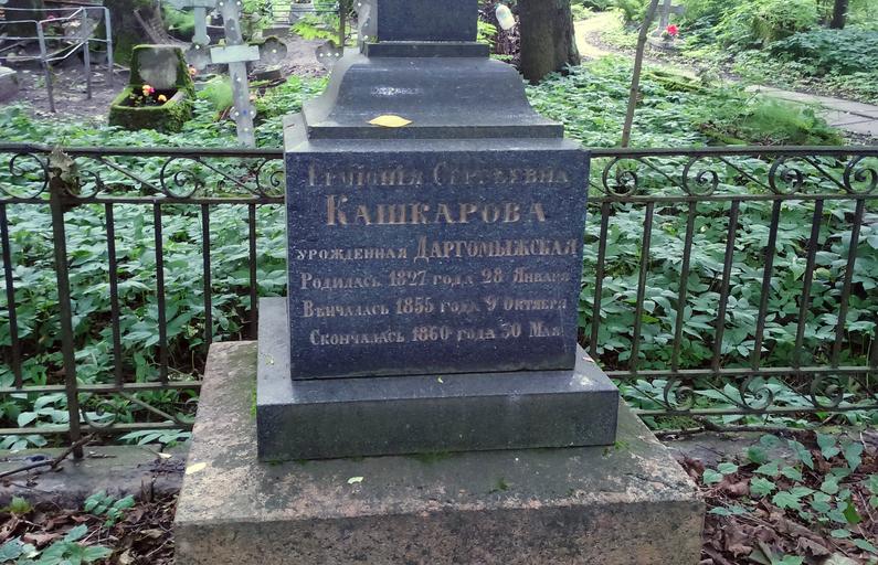 | Keywords: Ru-Kashkar-ES.jpg Art Photo en Kashkarova E S née Dargomyzhskaya burial at the Smolensk Orthodox cemetery ru Захо онение Кашка овой Е С у Да гомыжская на Смоленском п авославном кладбище 1860 stone Russia Saint-Petersburg Smolensk Orthodox Cemetery object history exhibition history credit line accession number artwork license PD-Russia photo date 2016-06-29 Dj-2 own photo license cc-by-sa-4 0 Smolensk Orthodox cemetery | ||||