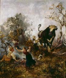 | Keywords: Rudolf Koller - Junger Stier, Kinder erschreckend.jpg Artwork Creator Rudolf Koller Oil on canvas cm 118 140 Bank Coop Basel accession number object history sold at Christie's Zurich 16 June 2008 lot 31 credit line RKoller ~ lower left signature http //www sikart ch/Werke aspx id 10080988 Schweitzerisches Institut für Kunstwissenschaften SIK-ISEA inventory number 2492 PD-old-100-1923 1905 DEFAULTSORT Koller Junger Stier Kinder erschreckend Rudolf Koller Paintings of children Paintings of cattle Images from SIKART |
