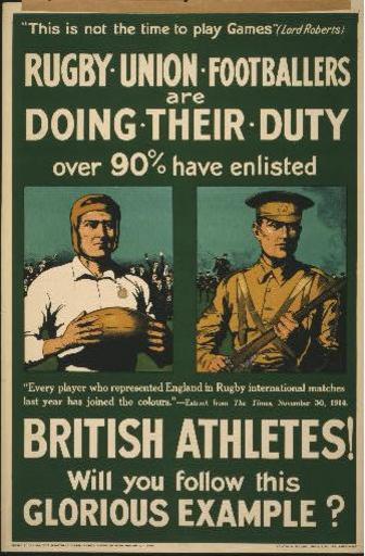 | Keywords: Rugby Conscripts.JPG en World War I recruitment poster using rugby union players as an example Library of Congress cph 3g10969 Central London Recruiting Depot 1915 Library of Congress PD-USGov World War I recruitment posters from the United Kingdom 1915 in rugby union |