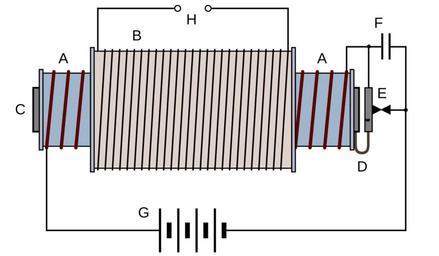 | Keywords: Ruhmkorff inductor schem.svg Induction coil Ruhmkorff coil circuit to generate high voltages The induction coil consists of a primary winding A of relatively few turns of coarse insulated wire and a secondary winding B of many turns of fine wire wrapped around an iron core C The battery G sends a DC current through the primary winding The interrupter E is pair of vibrating switch contacts which repeatedly breaks the primary current creating flux changes in the coil needed to induce a high voltage in the secondary coil The interrupter has an iron armature piece on a springy arm next to the coil's core When the current is switched on it creates a magnetic field in the iron core The iron interrupter arm is attracted to the core opening the contacts The primary current to the core is cut off the magnetic field collapses and the interrupter arm springs back closing the contacts again The primary current turns on again and the magnetic field attracts the arm again This cycle repeats rapidly 20 - 40 times per second Each time the primary current breaks and the magnetic field collapses it induces a voltage in the secondary winding Since the secondary winding has many turns the voltage is large large enough to cause a spark to jump across the spark gap H Small induction coils can create a 1 - 2 inch spark 40 to 80 thousand volts while large coils can can create sparks up to 40 inches about 1 million volts own based on File Ruhmkorffinductor svg public domain work of PieterJanR 2009-01-15 PieterJanR and Tescobar Ruhmkorff coil schematic 1 svg SVG electrical diagrams Induction coils |
