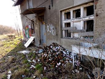 Keywords: ruin home decay old leave ghost town devastation weathered stainless dilapidated broken cans window