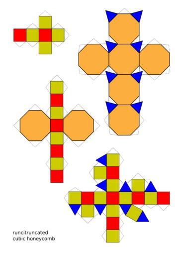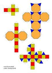 | Keywords: Runcitruncated cubic honeycomb nets.svg en This image contains the printable and folding outlines for the Cube Truncated Cube Octagonal Prism and Rhombicuboctahedron all on one sheet which conserves paper These are all of the four shapes required to build the repeating unit of the runcitruncated cubic honeycomb Tabs for glue positions have also been added as dotted lines When printed on A4 paper the edge lengths are approximately 15mm 2011-08-09 own A M cc-zero Uploaded with UploadWizard Diagrams Polyhedral net Polytopes Runcitruncated cubic honeycomb |