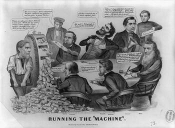 | Keywords: RunningtheMachine-LincAdmin.jpg ;Title Running the machine ;Summary A scathing attack on the ineptness and military ineffectualness of the Lincoln administration The cartoon derives its title from an indiscreet letter written by secretary of war Edwin McMasters Stanton to past President James Buchanan immediately following the Union army's defeat at the Battle of Bull Run Stanton wrote The imbecility of this Administration culminated in that catastrophe Bull Run and irretrievable misfortune and national disgrace never to be forgotten are to be added to the ruin of all peaceful pursuits and national bankruptcy as the result of Mr Lincoln's `running the machine' for five months William Pitt Fessenden far left cranks out greenbacks from Chase's Patent Greenback Mill Fessenden succeeded Salmon P Chase as Treasury secretary He says glaring at the figures seated around the table These are the greediest fellows I ever saw With all my exertions I cant satisfy their pocket though I keep the Mill going day and night Seated at the table clockwise from top left are Stanton Lincoln secretary of state William H Seward Navy secretary Gideon Welles and two unidentified contractors At left a messenger hands an envelope to Stanton announcing Mr Secretary here is a dispatch We have captured one prisoner and one gun; a great Victory Elated over this minuscule achievement Stanton exclaims Ah well Telegraph to General Dix Union general John A Dix immediately Meanwhile Lincoln is guffawing because he is reminded of a capital joke See The Commander-in-Chief Conciliating the Soldiers Votes no 1864-31 for the allusion Seward with a bell in one hand hands an envelope Fort Lafayette to a young officer or cadet saying Officer I am told that Snooks has called me Humbug'--Take this warrant and put him in Fort lafayette--I'll teach him to speak against the Government Seward was criticized for arbitrarily arresting civilians and incarcerating them in federal prison at Fort Lafayette Beside Seward Gideon Welles ineptly works out a problem They say the Tallahasse sails 24 miles an hour --Well then we'll send 4 Gunboats after her that can sail 6 miles an hour and that will just make enough to catch her At center bottom the two contractors ask for more greenbacks LOC-image cph 3a11882 Created/Published New York Published by Currier Ives 152 Nassau St N Y c1864 Medium 1 print on wove paper lithograph ; image 27 x 35 cm Cameron John b ca 1828 artist PD-old page was on en wikipedia http //en wikipedia org/w/index php title Special Log page File RunningtheMachine-LincAdmin jpg log All following user names refer to en wikipedia 2007-04-26 01 46 Grenavitar 1536×1124×8 195867 bytes <nowiki>better quality version I did this in paint but someone should be able to do a good job from the TIFF linked this is only 'better' </nowiki> 2006-12-26 22 33 The Mystery Man 579×430×8 72925 bytes <nowiki> PD-LOC http //hdl loc gov/loc pnp/cph 3a11882</nowiki> Caricatures of Abraham Lincoln William H Seward William P Fessenden Abolitionists United States Secretaries of the Navy Political cartoons United States in the 1860s Money in art Edwin McMasters Stanton |