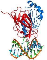| Keywords: Runx1-CBFB complex.png en Cartoon representation of the molecular structure of proteins and nucleic acid registered with 1H9D code This is ternary Runx1 AML1 -CBFβ-DNA complex The Runt domain of Runx1 is red and CBFβ is blue http //www rcsb org/pdb/explore/explore do structureId 1H9D PDBid 1H9D 2012-07-26 own Takuma-sa cc-zero Uploaded with UploadWizard Acute myeloid leukemia 1 protein AML1 RUNT domain | ||||
