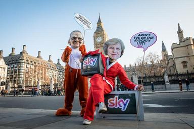 Keywords: rupert murdoch rupertmurdoch theresa may theresamay sky parliament takeover big ben bigben politics media freedom transparency avaaz fox leveson inquiry ofcom regulation regulator fit and proper fitandproper outdoor London, UK. 20/12/16. Protesters from the global civic movement Avaaz, dressed as Rupert Murdoch and Theresa May, demonstrate in Parliament Square to call on the British government to launch a full investigation into Rupert Murdoch before he can proceed with his planned takeover of Sky. Photo credit: Rob Pinney/Avaaz London, UK. 20/12/16. Protesters from the global civic movement Avaaz, dressed as Rupert Murdoch and Theresa May, demonstrate in Parliament Square to call on the British government to launch a full investigation into Rupert Murdoch before he can proceed with his planned takeover of Sky. Photo credit: Rob Pinney/Avaaz