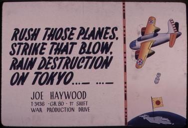 | Keywords: Rush those planes. Strike that blow. Rain destruction on Tokyo. - NARA - 534740.tif Scope and content General notes 534740 Local identifier 179-WP-889 Office for Emergency Management War Production Board 01/1942 - 11/03/1945 Still Picture Records Section Special Media Archives Services Division NWCS-S National Archives at College Park 8601 Adelphi Road College Park MD 20740-6001 other date circa 1942 1943 Record group Record Group 179 Records of the War Production Board 1918 - 1947 Record group ARC 508 War Production Board compiled 1942 - 1943 Series ARC 533858 File unit File unit ARC Variant control numbers NAIL Control Number NWDNS-179-WP-889 yes Other versions <gallery> File Rush_those_planes _Strike_that_blow _Rain_destruction_on_Tokyo _-_NARA_-_534740 tif tif File Rush_those_planes _Strike_that_blow _Rain_destruction_on_Tokyo _-_NARA_-_534740 jpg jpg </gallery> NARA-cooperation PD-USGov World War II posters from the United States NARA TIF images with categorized JPGs |