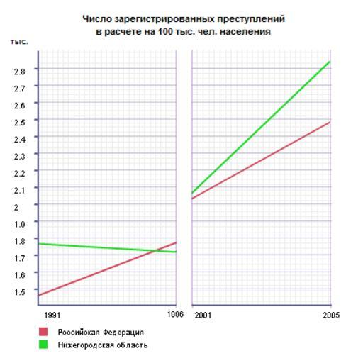 Keywords: Russia-NN crime chart.png en Chart of the crime rate in Russia in 1991 1996 and 2001 2005 Data based on http //www gks ru/dbscripts/Cbsd/DBInet cgi pl 2318002 Federal State Statistics Service ru Г афик числа за егист и ованных п еступлений в России и ижего одской области в пе иоды 1991 1996 и 2001 2005 Использованы данные http //www gks ru/dbscripts/Cbsd/DBInet cgi pl 2318002 Феде альной службы госуда ственной статистики own Ivan Simochkin 2009-04-22 Law of Russia |