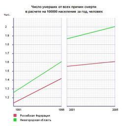 Keywords: Russia-NN death rate.png en Chart of death rates in <span style background-color d6495e >Russia</span> and <span style background-color 21da2a >Nizhny Novgorod Oblast</span> in 1991 1996 and 2001 2005 Data based on http //www gks ru/dbscripts/Cbsd/DBInet cgi pl 2415011 Federal State Statistics Service ru Г афик у овня сме тности в <span style background-color d6495e >России</span> и <span style background-color 21da2a > ижего одской области</span> в пе иоды 1991 1996 и 2001 2005 Использованы данные http //www gks ru/dbscripts/Cbsd/DBInet cgi pl 2415011 Феде альной службы госуда ственной статистики Own Ivan Simochkin 2009-04-22 graph Demographics of Russia Birth and death rates |
