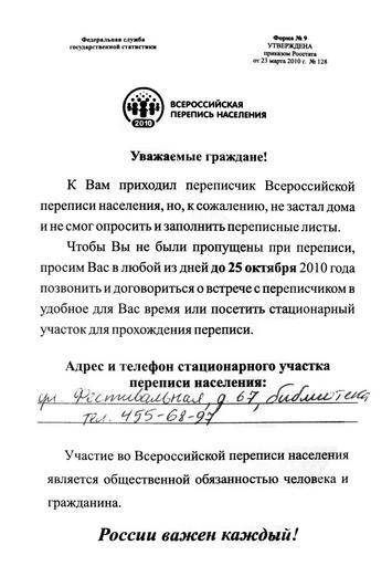 | Keywords: Russian Census 2010 - Form - 9.JPG  ru Бланк об отсутствии г ажданина дома в то в емя как к нему п иходил пе еписчик Transferred from http //ru wikipedia org/wiki/Файл Пе епись_2010_Бланк_об_отсутствии JPG<br/> Original text Собственная  абота; Феде альная служба госуда ственной статистики 2010-03-23 Goskomstat PD-RU-exempt PD-RU-exempt Russian Census 2010 |