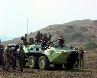 | Keywords: Russian KFOR BTR-70.jpg Source http //www dodmedia osd mil/ ID DASD0105976 This vehicle was misidentified; it is actually a BTR-80 recognizable by the flat engine deck and firing ports angled to the front Original caption Russian soldiers of the Kosovo Force KFOR position a BTR-70 Armored Personnel Carrier wheeled in the event of violence by an angry Albanian mob near the town of Domorovce Kosovo After two Serbian men disappeared the Serbians believe the Albanians abducted the men and began to make threats and road obstructions to stop the Albanians from traveling safely through town The Albanians began to form a mob to confront the Serbians until United States Army and Russian KFOR troops made a wall between the opposing sides Task Force Falcon Operation Joint Guardian 15 August 2000 Location DOMOROVCE KOSOVO YUGOSLAVIA YUG Camera Operator SPC ERIC HUGHES Date Shot 14 Aug 2000 PD-USGov BTR-80 in Russian service KFOR Kosovo Force Soldiers of Russia 2000 in Kosovo ImageNote 1 719 46 485 96 1268 1012 2 BTR-80 ImageNoteEnd 1 |